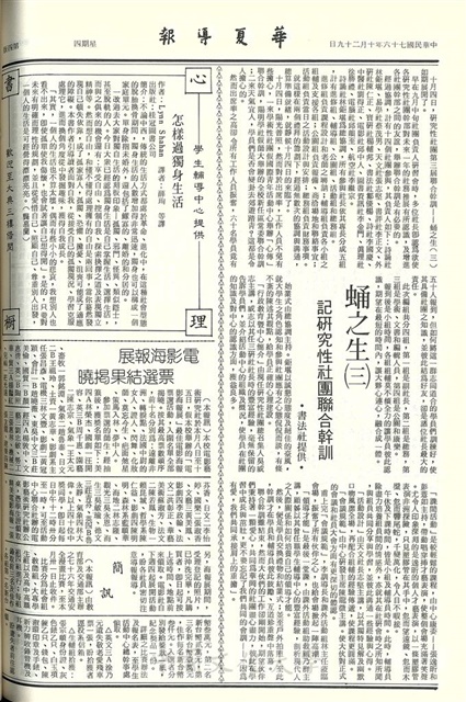 第三次師生座談會 今日假敬業堂舉行 ,領導才能研習延至下月舉行,華服隊 電影義演,演講消息,電影社放映 田園死神,學生活動中心舉辦華岡編輯人研習會,夜間部系際獨唱賽受理報名,迎新活動,畜牧學社擧辦跳蚤書市,天文入門營即日起報名,社員大會,巴洛克時期的音樂,魚蝦的樂團 - 桶後越嶺,汽車如何省油,大專盃橋藝賽 參賽名單,碑帖的種類,夏朝的大事,盲生讀報,記研究性社團聯合幹訓,怎樣過獨立生活,電影海報展票選結果揭曉