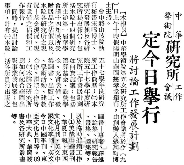 中華學術院於民58年11月9日舉行第五次研究所工作會議,由創辦人張其昀博士主持。