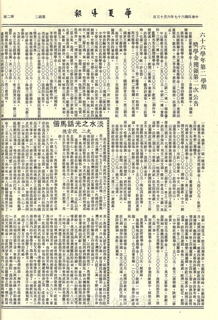 停課兩天準備考試 九月十四日辦理註冊,美國在華基金會 提供本校獎助金,公關室徵求女服務生,市政籃賽徵求歌曲,領取華岡年刊,華岡商店代理電器,語文中心徵求接待,魏偉琦記敘華岡教授羣,畜產加工霜淇淋 乃華岡人之口福,六十六學年第二學獎學金獲領第二次公告,淡水之光話馬偕