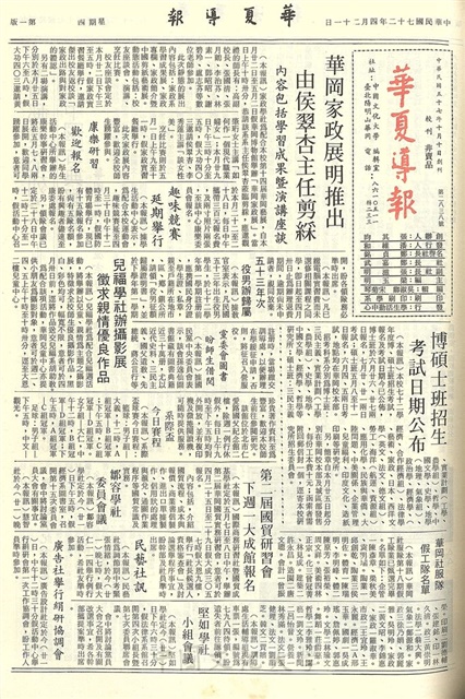 華岡家政展明推出,由侯翠杏主任剪綵,兒福學社辦攝影展,徵求親情優良作品,華岡社服隊假工隊名單,第二屆國貿研習會,下週一大成館報名,系際盃今日賽程,鄒容學社委員會議,民藝社訊,堅如學社小組會議,廣告社舉行絹研協調會,華岡郵展系列之一:中國古典郵票,學苑影展的功能:大學生請看國片,七十一學年度第二學期獎學金申請第七次公告,樂曲詮釋