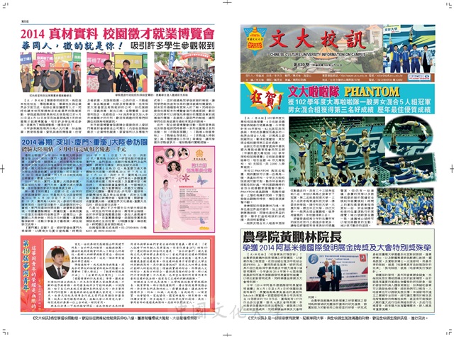 狂賀!文大啦啦隊 PHANTOM,農學院黃鵬林院長,華岡人群像 中文系一九六九年 第一屆畢業生 陳十美學姐,精彩演講 新聞系邀請媒觀基金會鄭瑞城董事長,2014暑期海外遊學熱情招生,學生諮商中心[心靈診所],2014真材實料 校園徵才就業博覽會,2014暑期「深圳、廈門、重慶」大陸參訪團,第49屆華岡青年,華岡親善團第12屆儲備團員招募