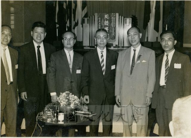 此為國防研究院第二期研究員菲律賓、泰國、越南訪問團一行25人由領隊徐培根教育長率團赴泰國進行為期四日訪問,訪問團分為軍事組與政治文教經濟組,分別拜會沙立元帥兼國務院長、國防部長他儂上將、華僑團體等政經單位首長。圖為學員曹俊(左二)、毛松年(左三)、領隊徐培根(右三)、學員王大任(右一)與泰國中華商會理事長合影。