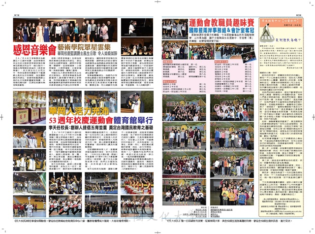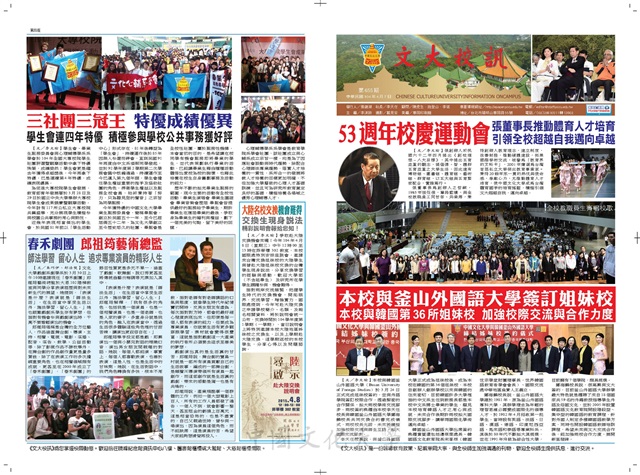 53週年校慶運動會,本校與釜山外國語大學簽訂姐妹校,感恩音樂會藝術學院眾星雲集,華岡人活力充沛53週年校慶運動會體育館舉行,運動會教職員趣味賽,學生諮商中心[心靈診所],三社團三冠王特優成績優異,春禾劇團郎祖筠藝術總監,大陸名校交換機會難得