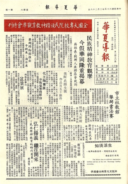 全國大專校院民族精神教育觀摩會特刊,民族精神教育觀摩假華岡隆重揭幕,華岡博物館推出平劇展、海洋展,美術系師生展作品百五十餘件,化工陶業展,分陶瓷等四部份,總務處舉行盆景展,市立社教館舉辦書法賽,韓國大使館來函徵求資料,弘仁揚義,繼往開來,民族精神教育在華岡,蔣公全身銅像今揭幕