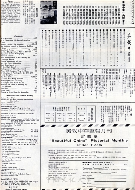 黨國元勳李文範先生,蔣彥士特使訪問中美洲七國,大音樂家黃有棣先生,日本梶浦逸外大法師,妙心寺大觀,韓國郭鍾元先生,曾國荃聯語書法,國家博士五十一位,外交部新建大廈,中華法學協會,林太夫人陳湘菱女士,龜山島,一所四育並重的新學府―輔仁中學,馬達加斯加風光,中華少棒隊關島之行,菱直支先生父女畫輯(六),苗家少女樂譜,華岡人在華視,林炎成先生攝影作品,明崔子忠蘇軾留帶圖,歐豪年先生國畫華岡齋色,華林新景,大仁館(姜雪峰攝),華岡花譜(九)―九月分,海外來鴻