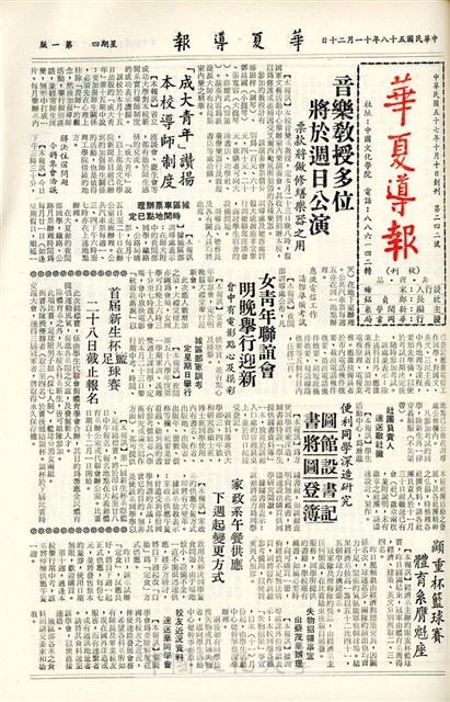 音樂教授多位將於週日公演,成大青年讚揚本校導師制度,城區車票辦理時間地點已定,解決住宿問題今將集合洽議,女青年聯誼會明晚舉行迎新,城區部軍訓考訂星期日舉行,首屆新生盃籃足球賽二十八日截止報名,社團負責人速送繳社徽,便利同學深造研究,家政系午餐供應下週起變更方式,顯重杯籃球賽體育系膺魁座,失物招領事宜由蔡茂華辦理,校友近況資料速送華岡學會,風雲人物,美國通訊,校友來鴻