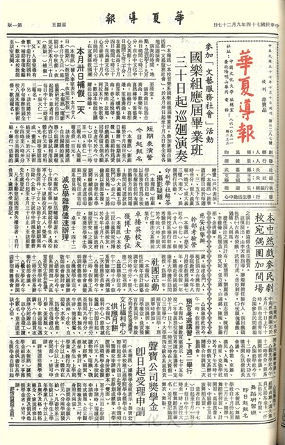 參加「文藝服務社會」國樂組應屆業班三十日起巡迴演奏,短期表演營今日起報名,卓播英校友博士學位,本月卅日補假一天,慈安社舉辦幹部考驗營,減免學雜費盡速辦理,社團活動,預官考選講習下周二舉行,文化福利中心供應月餅,舞蹈研習班即日起報名,本校中宛然偶戲團參加民間劇場,聲寶公司獎學金即日起受理申請,一位難忘的長者,送師西行,敬輓曉公夫子