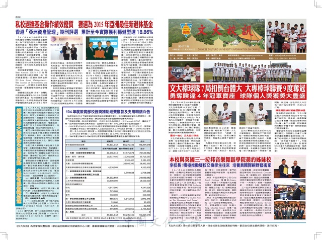 文大綁球隊7局扣倒台體大大專棒球聯賽9度奪冠,本校與英國三一拉邦音樂舞蹈學院簽約姊妹校,隨著心走!我們到大陸交換去!,105學年度第1學期赴大陸交換學生甄選簡章,屬於全球校友的年度盛會今年在吉隆坡相見,2016美國暑期實習旅遊計畫敬請把握最後機會!,學生諮商中心[心靈診所],私校退撫基金操作績效優質 獲選為2015年亞洲最佳新退休基金,超值暑期大陸參訪交流團活動名額有限欲報從速 ,104學年度教育部校務獎補助經費撥款及支用明細公告