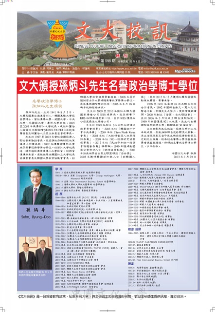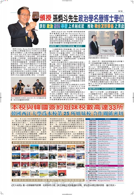 文大頒授孫炳斗先生名譽政治學博士學位,本校與韓國簽約姐妹校數高達33所