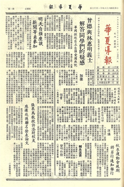曾德與林惠明義士 解答同學們的疑惑,明天自強座談 新聞等系參加,城區部大傳系 創系十四週年,黃志成等同學 或研究發明獎,演講,秋季運動會延期 將另行通知,張果為教授許添財校友 應邀赴德聯名發表論文,歡迎校友返校參加年會,歡迎校友返校 園遊活動助興,校友暨議士會 今日上午舉行,華岡學會強化總會辦法,華岡基金會勸募章程
