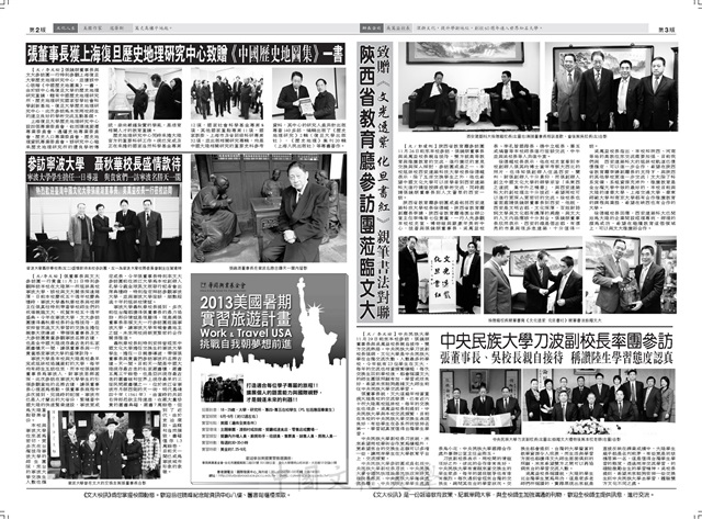 文大與上海復旦大學簽訂學術交流與合作協議,墨西哥CETYS大學正式與本校簽訂姐妹校關係,張董事長獲上海復旦歷史地理研究中心致贈《中國歷史地圖集》一書,參訪寧波大學 聶秋華校長盛情款待,2013美國暑期實習旅遊計畫,陝西省教育廳參訪團蒞臨文大,中央民族大學刀波副校長率團參訪,第二屆華岡建築國際工作坊開跑,電機系師生聯隊頻頻拿下優異成績,屬於文化學生的App