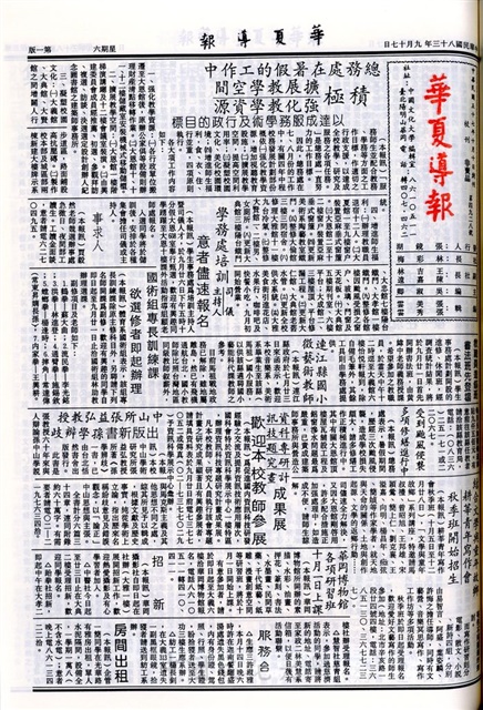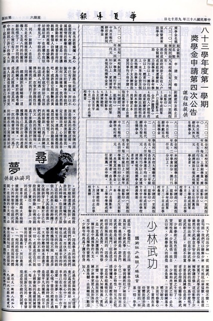 總務處在暑假的工作中積極擴展教學空間強化教學資源,以達成服務學術及行政的目標,學務處培訓司儀.主持人,意者儘速報名,教職員進修班書法班先登場,國術組專長訓練課欲選修者即起辦理,結合文學與童年故鄉耕莘青年寫作會秋季班開始招生,資訊科技專題研究成果展歡迎本校教師參展,華岡博物館各項研習班十月一日上課,中山所張益弘教授出版新書<孫學辦岐>,詮釋學淺說,真愛,博士班.碩士班新生領學生手冊,集體神經病與音樂治療,八十三學年度第一學期獎學金申請第四次公告,少林武功,尋夢