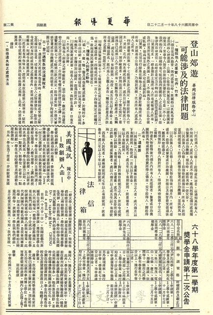 美術系走廊今起展出海報封面景觀等設計,園藝學系演講消息,俞筱鈞出席亞太區會議,詩歌朗誦賽八日前報名,賀高普考錄取同學城區部講擧行餐會,文學院越野賽跑盼有關系級參加,系組全名統一使用,橋藝社論對賽,登山郊遊可能涉及的違法問題,六十八年度第一學期獎學金申請第十二次公告,美國通訊