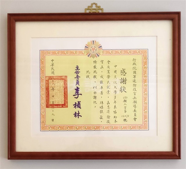 1999年4月29日國軍退除役官兵輔導委員會致贈本校推展就業服務感謝狀