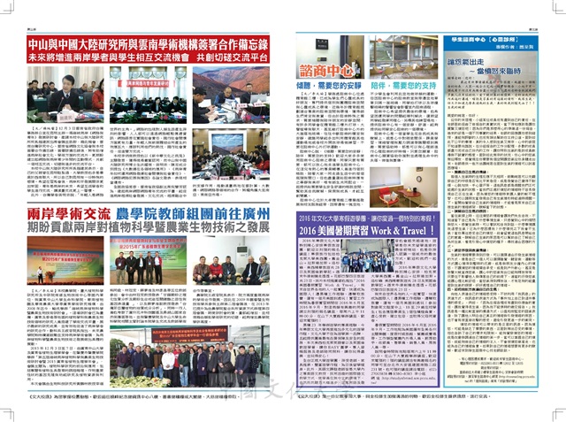 本校與百齡高中簽訂策略合作協議,2015追求大學教學品質提升國際研討會,中山與中國大陸研究所與雲南學術機構簽署合作備忘錄,兩岸學術交流農學院教師組團前往廣州,諮商中心,2016年文化大學寒假遊學團 - 讓你度過一個特別的寒假!,學生諮商中心[心靈診所],築˙夢九大主題 烘焙為學生開啟一段精彩海外學習之旅,104學年度畢業典禮致詞生代表名單,2016總統教育獎遴選