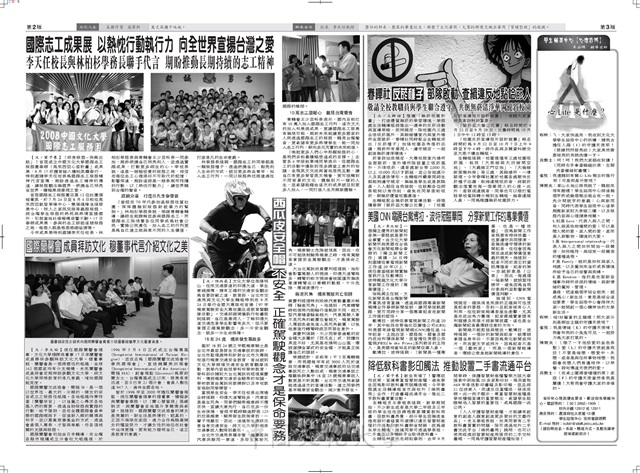 ,國際志工成果展以熱忱行動執行力向全世界宣揚台灣之愛,國際蘭馨會成員拜訪文化穆董事代言介紹文化之美,西瓜皮安全帽不安全正確駕駛觀念才是保命要務,春暉社反菸種子部隊啟動查緝違反地點哈菸人,美國CNN電視台戴博拉。波特蒞臨華岡分享新聞工作的專業價值,降低教科書影印觸法推動設置二手書流通平台,學生諮商中心[心理診所],你社團加了沒?!百家社團聯合強力徵召新鮮人,新傳學院沈慧聲院長出席邱瑞金攝影展,維護美食廣場簡約明亮總務處呼籲回收餐具