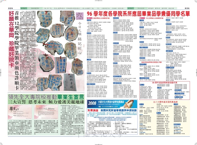 展翼華岡快樂出航96學年度畢業典禮今日於體育館隆重舉行,歡送九十六學年度畢業同學,好願在華岡珍藏好願卡,領先全大專院校推動畢業生宣言 ,96學年度各學院系所應屆畢業品學兼優同學名單,2008中國文化大學海外留學免費講座,華岡青年35位同學或第43屆華岡青年獎,傑出社團法律系學會華岡同濟社特優第一,全國大專優秀青年17位獲選,新聞一王靜誼擔綱畢業典禮司儀,在校生代表致歡送詞,畢業生代表致答詞