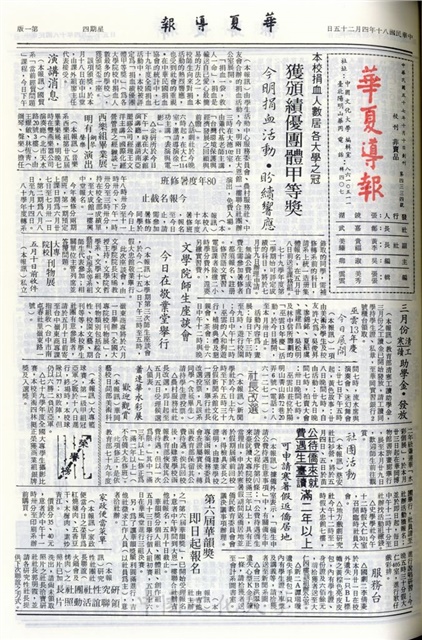 本校捐血人數居各大學之冠 獲頒績優團體甲等獎,演講消息,西樂組畢業展 明有鋼琴 聲樂演出,80年度暑修班 今報名截止,巫雲13年慶 今日展開,文學院師生座談會 今日在敬業堂擧行,大專院校刊物展 五月十日前收件,三月份清寒工讀助學金˙發放,社長改選,蕭連華水彩展 歡迎觀賞,公費待遇僑生來臺就讀滿二年以上 可申請寒暑假返僑居地,第六屆華韻獎 即日起報名,家政便當菜單,研究性社團社長領聯誼活動照片,榮譽榜,打球前的基本知識 選擇球桿,淺談星座的由來,家政便當的製作過程,從物象步入心象 淺評鐘敏建的畫,如何收集 整理喜愛的郵票,本學期申請助學貸款 未符合中低收入家庭標準者名單,如歌的行板 文藝散文即席寫作比賽受理報名,妳知道狼在等妳嗎? 不教罪犯輕易近身