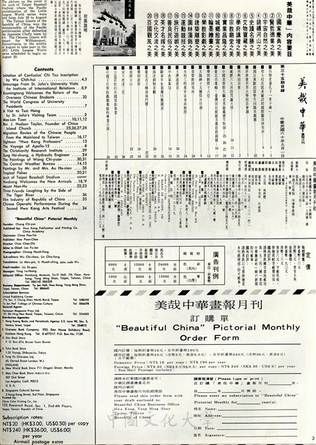 稚老摹孔子「季子碑」,聖大校長凱希爾訪問國際關係研究所,國民黨歡迎留學生回國省親團,菲律賓世界大學校長會議,再興迎嘉賓,遍歷六大洲段茂瀾大使,中國基督教先驅者英籍戴德生牧師,台北市專輯-台灣居民祖籍及遷徙路線圖,華岡教授十八位,太陽神十五號探月任務,基督教研究所,水利工程專家宋希尚教授,王濟遠畫頁,中央氣象局,歐豪年朱慕蘭伉儷圖畫,海洋動物奇觀,台北市立棒球場門樓,華岡迎新,南湖大山,宋人虎溪三笑,日益茁壯的我國電影事業,中國文化學院戲劇專修科畢業公演