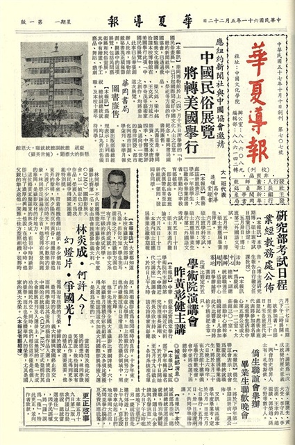 應紐約新聞社與中國協會邀請,華岡書局 圖書廉售,大一班代表 速領高中畢業證書,研究部考試日程 業經教務處公佈,活動中心舉辦越野賽跑,學術院演講會 昨黃彰健主講,僑生聯誼會舉辦 畢業生聯歡晚會,城區部消息,林炎成‧何許人? 幻燈片‧爭國光!,戲劇系的十年,最高樓大恩館,芝麻街,他高高的個子留戀著華岡,科學藝術與攝影,哈哈樂園,想一想,恭祝 總統五次連任就職 本校趙廣暉教官特為金石,學者、研究者、創業者