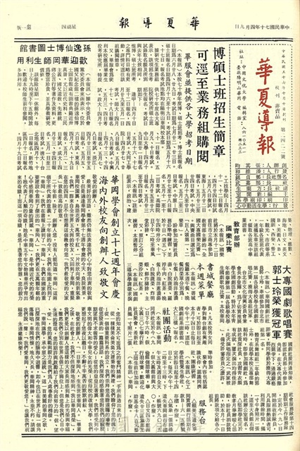 博碩士班招生簡章可逕至業務組購閱,孫逸仙博士圖書館歡迎華岡師生利用,教育部辦國樂比賽,大專國劇歌唱比賽郭士玲榮獲冠軍,華岡學會創立十七週年會慶海內外校友向創辦人致敬文,台東金峯之行