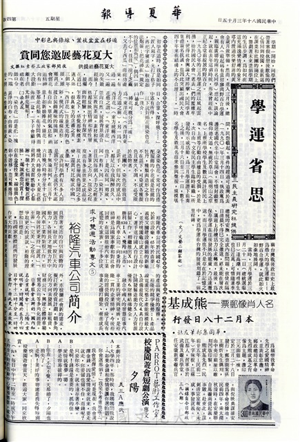 社長聯度大會 今假興中堂擧行,社團負責人溝通餐會 廿一日舉行,大夏系際盃籃賽 明後日初賽,生態攝影展 得獎名單公佈,玫瑰傳情 下週一起預售,宿舍空床位 意者速申請,地理學社參加 地科盃球賽,影三生命科學 上課地點更動,獎學金消息,國科會研究獎助費 本校十四位老師獲獎,榮譽榜,本校資訊電腦中心 提供申報所得稅服務,知名企業說明會 今介紹四家公司,烤肉,家政便當 金有炒花枝,社團會議,影片欣賞 ,社團活動,雨過天青雲破處 大屯山區氣候簡介,炁是什麼?,研究生預官兵 今日上午抽籤,大家選好片 歡迎同學提供好片,電腦研習營 即日起報名,觀光學社舉辦 桌、撞球賽,琴格之音一口琴簡介,刑事專題 遊手好閒,吉羊如意 慈安幹訓營〜薪傳,墾丁之美觀(上),你是我的維他命,事求人,學運省思,名人肖像郵票一熊成基,大夏花藝展邀您同賞,裕隆汽車公司簡介,夕陽