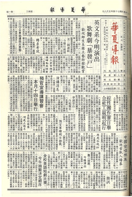 英文系今明演出歌舞劇「暴發戶」,美三國畫組 今舉行班展,轉系考試,二六O公車站遷回大恩館,徐文貞等獲得愛暉勳章證書,演講消息,綜合性社團工作競賽明日起舉行,夢湖登山 今起報名,預官宣導講習會 本月十四日舉行,預官軍種明日抽籤,系際羽球賽 明截止報名,中國合唱樂展 歡迎索取入場券,慈恩卡退件,舞二班展 今晚演出,傳統掌中戲簡介,桌球專欄,世界劇展的回顧與展望,革命先烈—徐錫麟,電影欣賞應注意事項