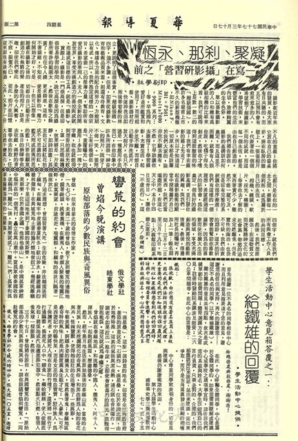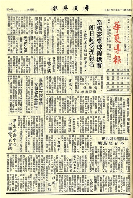 系際盃桌球錦標賽 即日起受理報名,舞蹈研習班即日起報名,更改姓名等廿四日前辦理,國樂組畢業班 今晚公演,電腦設資訊書展,選課清單更正即起辦理,上學期修晨網課 今明領回網球,畢業班代表會議今假敬業堂舉行,學生活動中心召開班代表會議,法律週系列活動 今日起展開,登大桶烏來山 即起報名,參觀國家建設今起登記,凝聚、剎那、永恆,學生活動中心意見箱答覆之一:,蠻荒的約會 曾焰今晚演講,廣告設計一週話題 剪紙,國樂社簡介,談天,農服社 電影義演,七十六學年度第一學期學生活動中心 學生活動費支出一覽表,茶香從何來