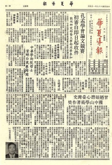 孔孟學會論文競賽初審自即日起收件,各班代表領繳費單,徐曉明談數值預報,成棒梅花旗賽本校暫時領先,速讀自練法今辦理借閱,張麗堂談選舉,合唱考試,中華學術院哲士葉醉白載譽歸國,曾迺碩潛心台灣史獲中山學術著作獎,華岡六十八年度各所系校友同學高普特考錄取名單