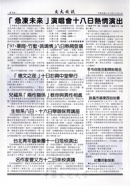八十六學年度大專杯棒球聯賽文大蟬聯冠軍為本校再添光榮,海青技訓班保薦委員五日蒞校訪視,研究生宿舍遞補,美國姊妹校交換生甄試辦法公布,男同學,你報名了嗎,新生盃書法比賽得獎名單公布,通告,下學期大學部校本部預選課作業十二月十日至十二日受理辦理,英文系本學年度學術研討會十日舉行,國防重大事務委研究計畫受理申請,央圖博、碩士論文補助金申請辦法,本學年度赴日短期留學獎學金甄試公布,「認識職業資訊中心」有獎徵答得獎名單公布,陳莉蓮運動成績優獎學金,AIESEC點燈系列活動十五日展開,中國文化大學教學空間面面觀,「急凍未來」演唱會十八日熱情演出,「97、華岡、竹塹、琉璃情」八日熱鬧登場,冬令自強活動開始報名,跳蚤市場東西俗俗賣,「德文之夜」十日於興中堂舉行,兒福系「兩性關係」教你與異性相處,生物系八日、十日舉辦保育講座,台北青年國樂團十一日蒞校演出,名作家曹又方十二日來校演講,社團活動剪影