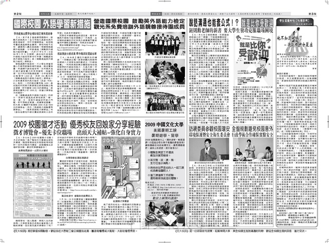 日本淑德大學商學院院長岡田匡令率師生15人來訪,環場街景開進華岡校園720度虛擬華岡實境,國際校園外語學習新措施營造國際校園鼓勵英外語能力檢定觀光細免費培訓外語親善接待團成員,2009校園徵才活動優秀校友回娘家分享經驗,說話溝通也能套公式!?就是比你受歡迎,2009中國文化大學美國暑期工讀暑期遊學、留學,訪視委員參觀校園環安全盤規劃避免校園意外,學生諮商中心[心理診所],華岡管樂社榮獲97學年度北區音樂團體優等,大雅摸彩大放送第三週得獎名單公布,小文化大視野3月28及29日學習新營隊,小王子麵傳情擺脫傳統送花送巧克力俗氣法