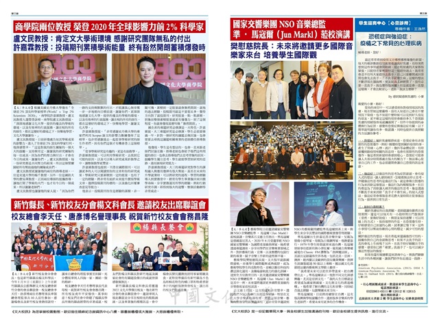 國貿系邀請威滿興業周明璋董事長蒞校演講,文大跨領域人才全國排名第五 網路聲量居私校之首,踏出國際 勇敢學習 即日起至3月4日前開放申請,文大與基隆暖暖高中簽訂策略聯盟,商學院品牌影片《做自己的CEO》,商學院兩位教授 榮登2020年全球影響力前2%科學家,國家交響樂團NSO音樂總監準‧馬寇爾(Jun Markl)蒞校演講,學生諮商中心〔心靈診所〕