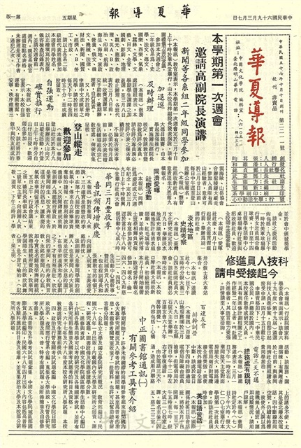 本學期第一次週會 邀請高副院長演講,加退選 及時辦理,自強運動 確實推行,淡水地區 史蹟考察,華岡三月豐收季 喜訊頻傳增歡慶,科技人員進修 今起接受申請,百達友會 辦幹訓營,電話三天不通 總務處有說明,英日語會話,中正圖書館通訊(一)有關參考工具書介紹,中國文化學院第十八屆校慶,播暉社・犧牲寶貴假期 金崙鄉・洋溢華岡溫情