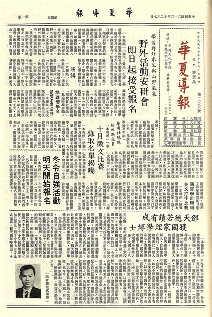 學習野外求生與山野新氣象,演講,地理獎學金 領獎名單公佈,華岡服務隊 招收新社員,十月徵文比賽 錄取名單揭曉,國貿學社擧辦英文打字比賽,冬令自強活動 明天開始報名,鄧天德苦讀有成 獲國家理學博士,從比較哲學的觀點看西方哲學之精神及中國哲學應有之展向,獎學金申請公告