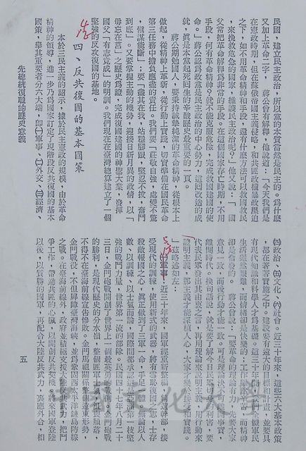 一. 蔣公認為國共內戰會失敗的原因乃是源於黨內人士對三民主義思想的動搖,並引用孫中山先生的話:「主義是一種思想,一種信仰,一種力量。」,來解釋黨人對於思想動搖所造成的負面影響,故蔣公的復行建國的第一要事,便是弘揚三民主義。