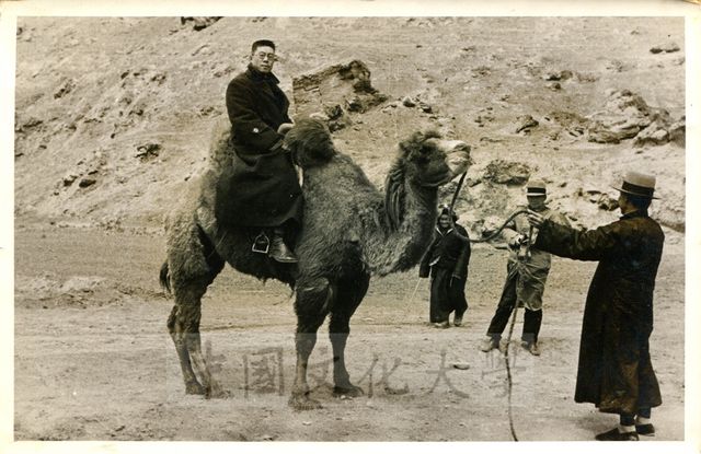 西北旅行考察,在民國二十三年九月十日至二十四年八月六日,達一年之久。同行有畢業生林文英、李海晨與任美鍔。以蘭州為中心,循河西走廊至敦煌,南越秦嶺山脈至漢中,北上蒙古高原至綏遠北部百靈廟,又曾到青海大湖邊上及甘肅西南隅拉卜楞喇嘛寺。照片為創辦人於寧夏騎乘駱駝的留影。