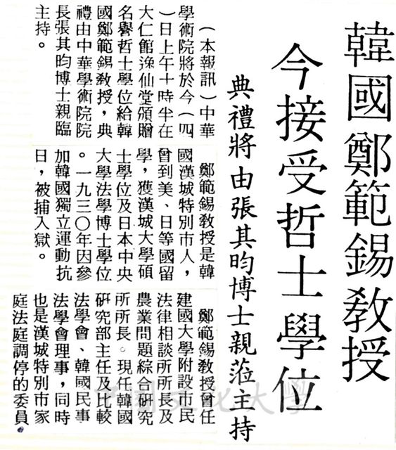 中華學術院於大仁館逸仙堂頒贈名譽哲士學位給韓國鄭範錫教授,典禮由中華學術院院長張其昀博士親臨主持。