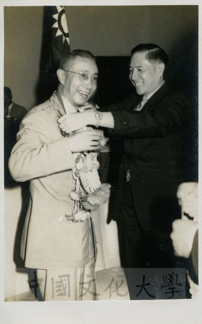 此為國防研究院第二期研究員菲律賓、泰國、越南訪問團一行25人由領隊徐培根教育長率團赴泰國進行為期四日訪問,訪問團分為軍事組與政治文教經濟組,分別拜會沙立元帥兼國務院長、國防部長他儂上將、華僑團體等政經單位首長。圖為領隊徐培根(左)與駐泰國大使杭立武(右)。