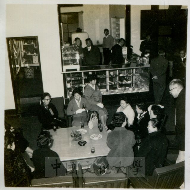 此為國防研究院第二期研究人員與三軍聯大正規班第九期學員於1960(民國49)年12月19號上午在三軍聯大禮堂合併舉行畢業典禮,並於典禮結束後至介壽堂舉行餐會。圖為研究學員女眷寒暄景況。
