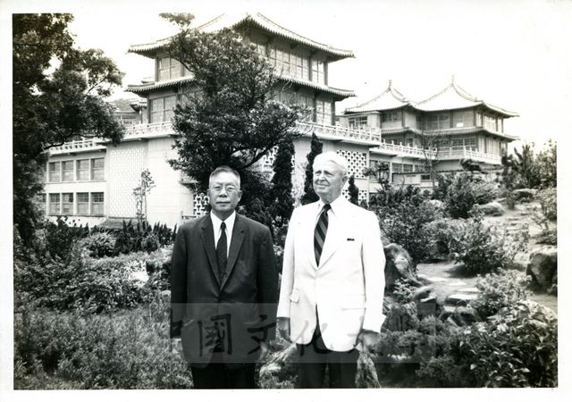 民國62年7月17日,抗戰時期任盟軍中國戰區最高統帥,蔣委員長的參謀長魏德邁將軍訪問本校與張創辦人合影。