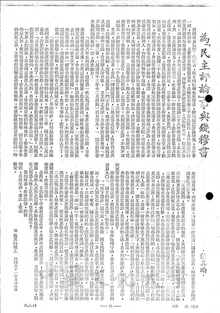 此為張其昀致錢穆(賓四)先生信函,內容有關自己願以美金三千元為條件,希望民主評論為文刊載攻擊自由主義之文字,向錢穆先生說明此為莫須有之事,實為徐復觀先生所憑空捏造。
