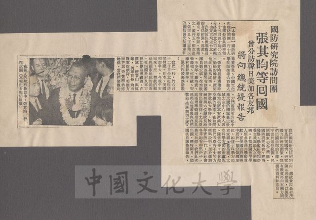 國防研究院訪問團一行十人,由團長張其昀率領,訪問韓日美加四國,行程結束返國,將向 總統提報告。