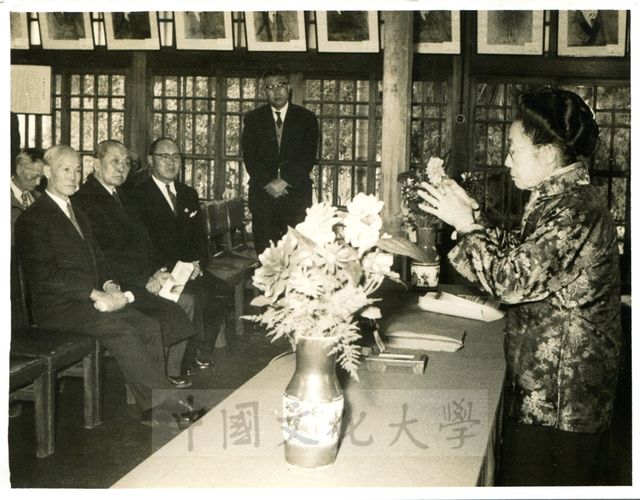 考試委員張默君以珍藏之古玉致贈國立歷史博物館,敘述其藏玉經過,立者為張部長其昀,坐者自左至右陳誠、莫德惠、何應欽。[聯合社新聞照片]