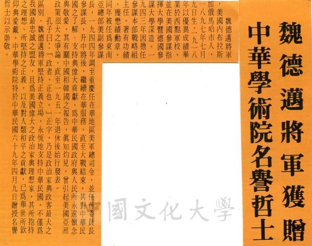 魏德邁將軍簡介及獲贈中華學術院名譽哲士相關報導