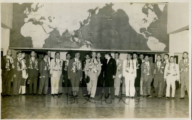 此為國防研究院第二期研究員菲律賓、泰國、越南訪問團一行25人由領隊徐培根教育長率團赴泰國進行為期四日訪問,訪問團分為軍事組與政治文教經濟組,分別拜會沙立元帥兼國務院長、國防部長他儂上將、華僑團體等政經單位首長。圖為駐泰國大使杭立武及訪問團全體學員合影景況。