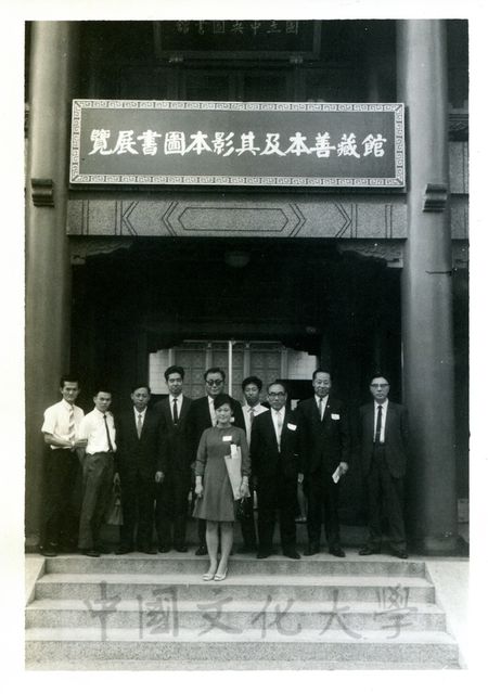 國立歷史博物館館長包遵彭博士邀請第一屆國際華學會議各國代表前往博物館參觀文物長江萬里圖與國立中央圖書館,照片為參訪代表在國立中央圖書館館藏善本及其影本圖書展覽佈板下合影。。韓國前教育部長李瑄根博士(中後),會議代表札奇斯欽先生(右四)。