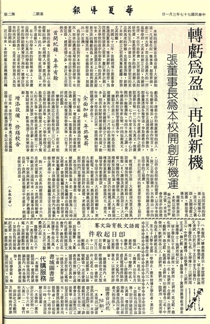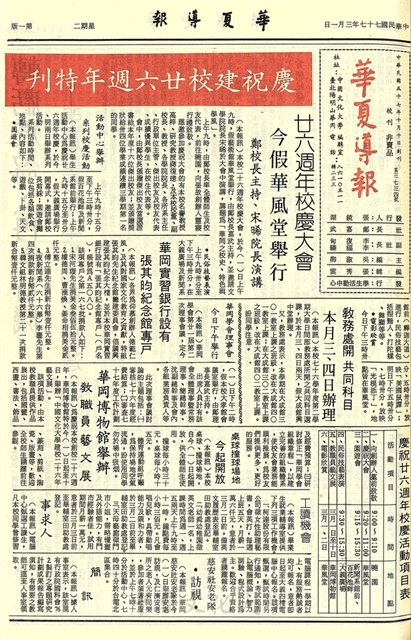 廿六週年校慶大會今假華風堂舉行,活動中心擧辦系列校慶活動,教務處開共同科目本月三、四日辦理,華岡學會理事會今日下午擧行,華岡實習銀行設有張其昀紀念館專戶,桌球撞球場地今起開放,華岡博物館擧辦教職員藝文展,圖與文,慈安社安老隊‧訪視‧,轉虧為盈、再創新機,國語文教育論文賽即日起收件,書城圖書部代購服務,圖書資訊社招新,本校篳路藍縷底於發揚光大,華岡之校史、特色與學風,本校七十七年度傑出校友名單,在校生連續三學期學業成績第一名名單