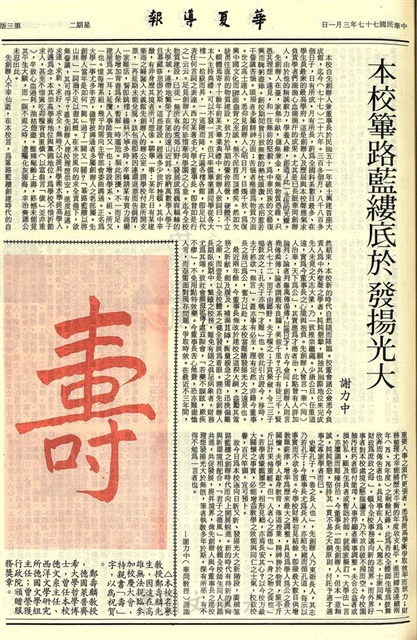 本校名譽教授鄭壽麟先生,因遠在高雄無法親臨校慶大會,特親書「壽」字,以為祝賀。