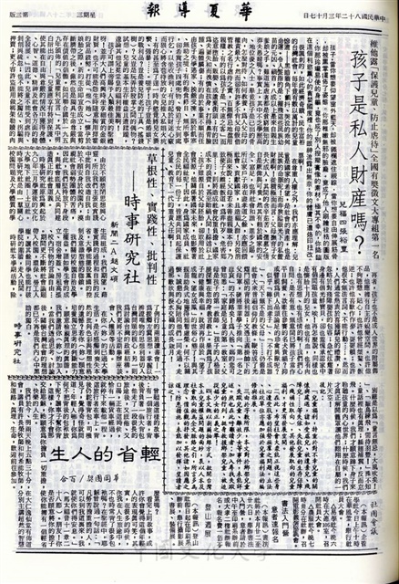 日間部新建大樓 請師生一起來命名,教育部學術獎 月底截止申請,活動費補助 學生議會審議中,畢服會召開 專委籌備會,出航—系列演講 首場於十九日擧辦,演講消息,下學年度宿舍申請 即日起受理登記,家政系模特兒今午甄選,嘉友會舉辦谷口渡假村露營,應數週專文(三) 成人的童話―認識一點拒扑空間 ,電影社影片介紹 後窗,英年早逝的鋼琴巨匠 狄努・李帕蒂,維他露「保護兒童、防止虐待」全國有獎徵文大專組第一名 孩子是私人財產嗎?,草根性、實踐性、批判性―時事研究社,書法入門營 意者速報名,登山週展,輕省的人生,前程規劃分析(二)青年就業與公職考試,俄文週專文 俄羅斯之窗,電話禮節