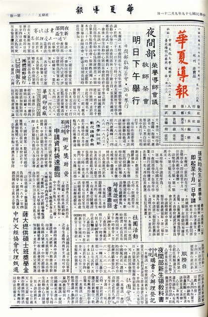 夜間部榮譽導師會議 教師茶會明日下午舉行,夜間部新生盃書法比賽下週一止受理報名,華岡印刷廠加強服務品質,大傳學社迎新歡迎踴躍參加,張其昀先生紀念獎學金即起至十月一日申請,歸屬證明書儘速繳回,夜間部新生領教科書,國科會第二期研究獎助費申請資料袋速繳回,薩大提供碩士班獎學金 中阿文經協會代理甄選,財團法人華岡文教基金會張其昀先生紀念獎學金設置辦法,訓導處修訂獎懲規則,大學暨獨立學院研究生獎助學金辦法,國科會將改善學術研究獎助措施,本校79學年度第一學期博碩士在學研究生申請教育部獎助學金 有無兼職 調查表說明,本學期語文實習(二),講義雜誌九折優惠學生,78學年度第二學期研幹會經費收支表,語文實習加退選今起一週內辦理,團體訂購教科書請華岡書城圖書部代勞,視聽障礙學生獎助金申請要點公布,一抹淡彩添絢爛